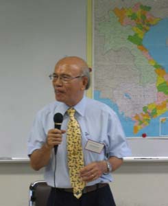 ベトナム子ども基金は8月28日、ベトナム青葉奨学会のグエン・ドク・ホゥエ代表(写真)をアジア文化会館に招き報告会を開催、会員約30名が参加した。報告会に先立ち、子ども基金がこのほど制作した、「2005年ベトナム子どもカレンダー」を近藤昇代表からホゥエ氏に贈呈した。ホゥエ氏は、7月にハノイで行われた里子訪問ツアーの成功のほか、奨学生や日本への留学生について、今後の課題と期待を交えて、概略以下のとおり報告した。
