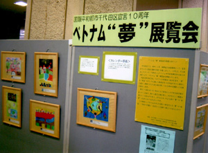 多くの人びとにベトナムの子どもたちのことを知っていただきたいと、「ベトナム『夢』展覧会」が開催されました。会場となった、東京都千代田区役所1階ロビー(7月27日〜8月2日)と、いきいきプラザ一番町1階区民ギャラリー(8月5〜13日)には、たくさんの方々に青葉奨学生が描いた絵に関心を持って見ていただきました。